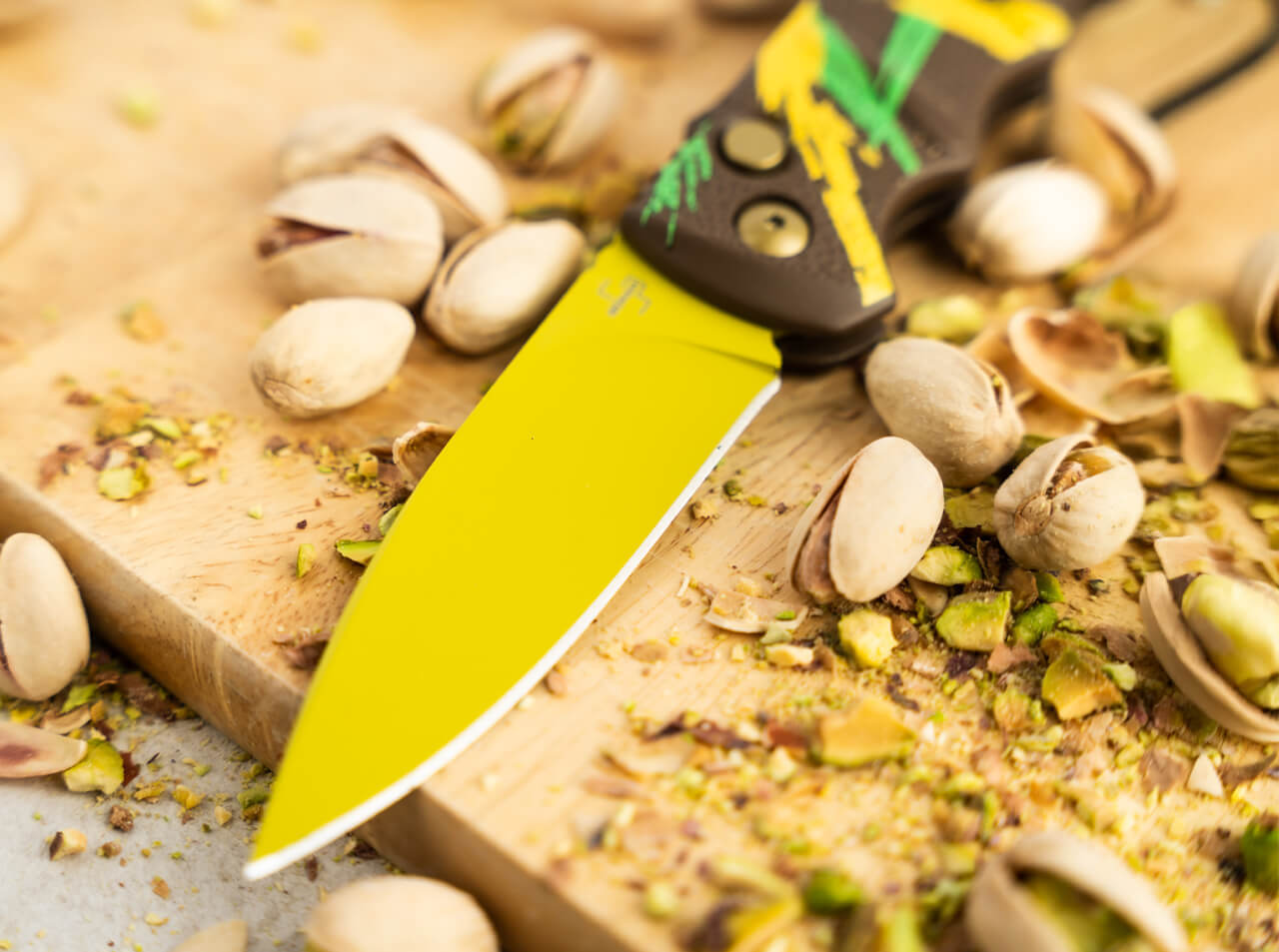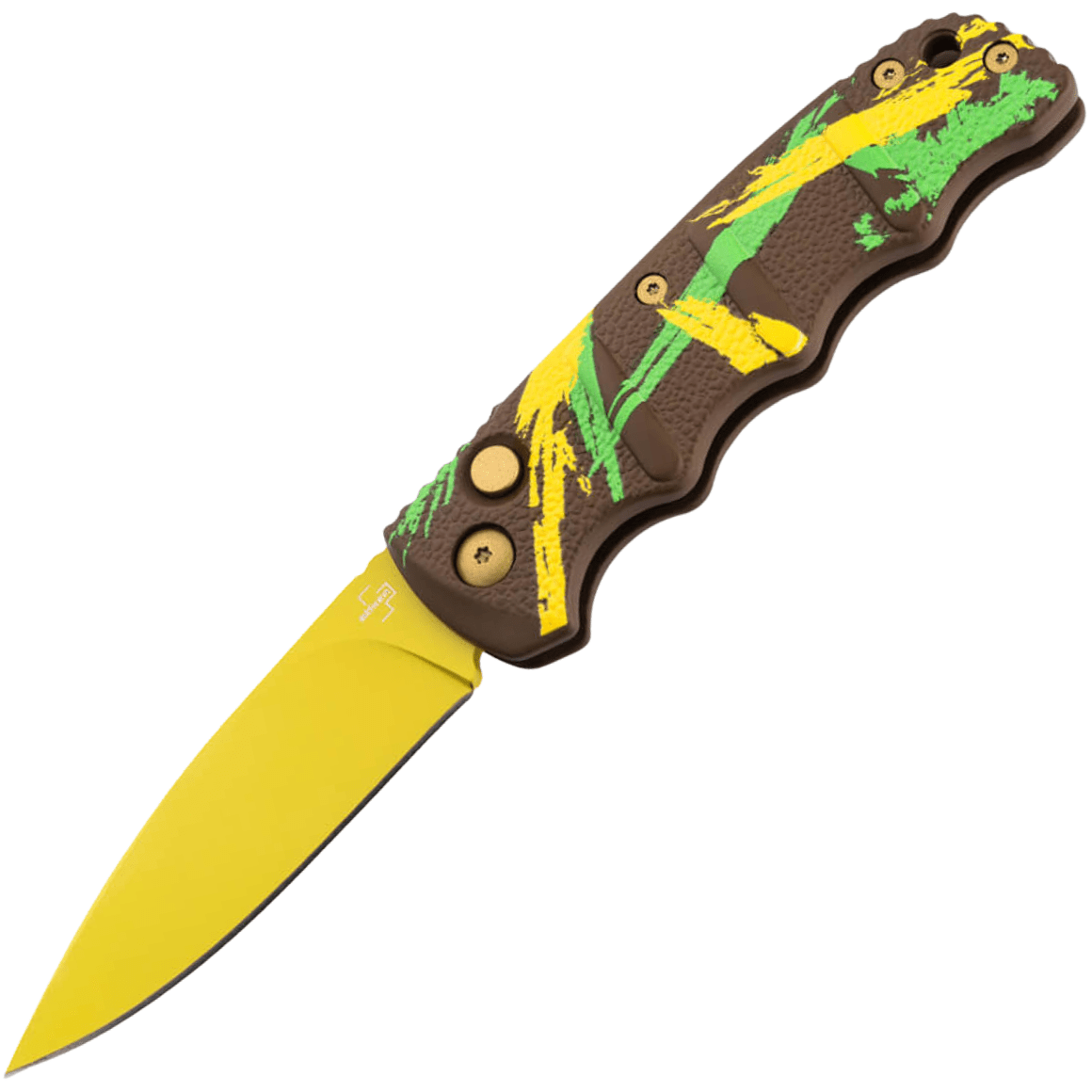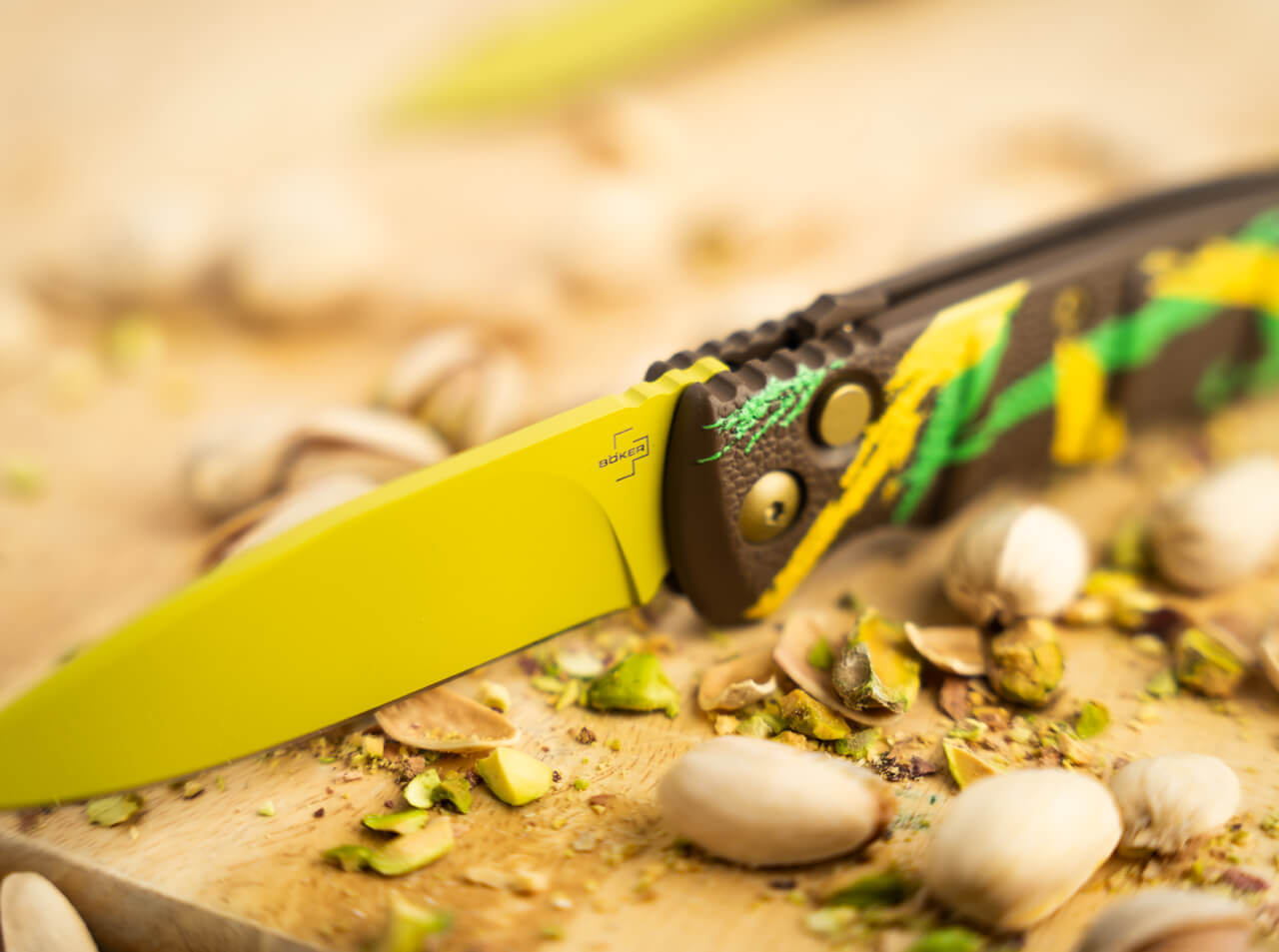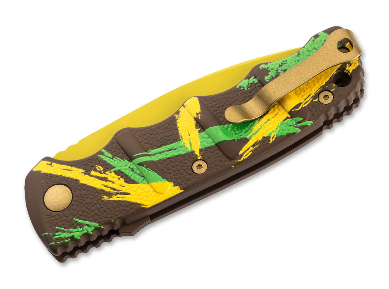 A Boker Plus AKS-74 a Kalashnikov sorozatból kétségtelenül az egyik legnépszerűbb Boker Plus modell, amelyet az elmúlt években számos különböző változatban gyártottak. Ebben a különleges Dubai Chocolate Edition kiadásban az alumínium markolat zöldesbarna és sárga színvilággal rendelkezik, utalva a vágyott édességre, miközben a kiemelkedő textúrájú bolsterek biztos fogást nyújtanak bármilyen helyzetben, annak ellenére, hogy olvadós karakterük van. A sárga bevonatú penge rozsdamentes D2 acélból készült, és a markolat tetején található csúszózárral is rögzíthető a nyomógomb mellett. A kés tartozéka egy zsinórlyuk és egy praktikus klip (tip-up/r).
