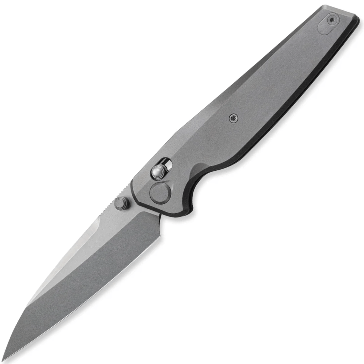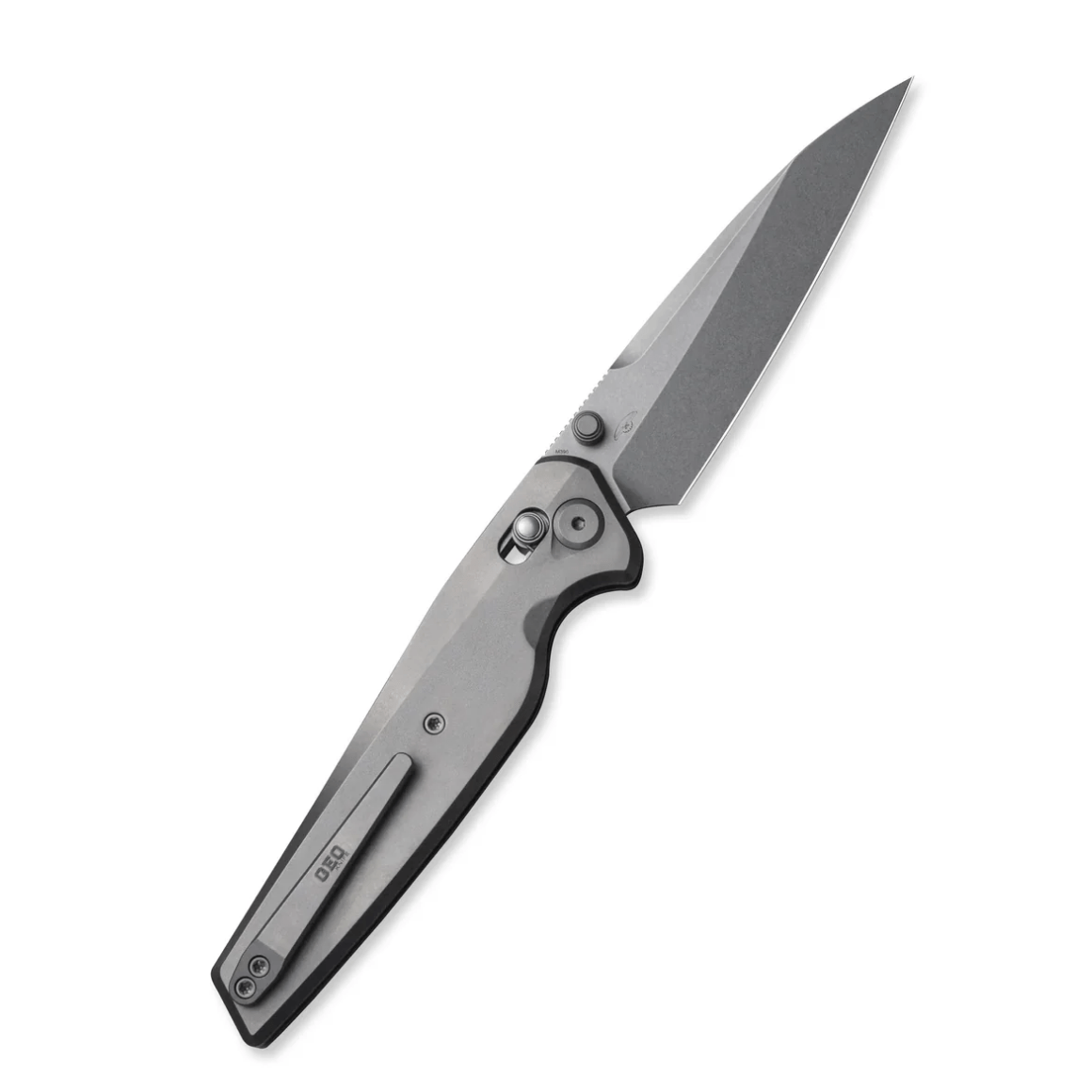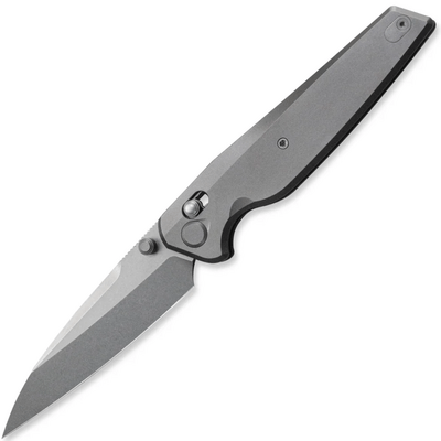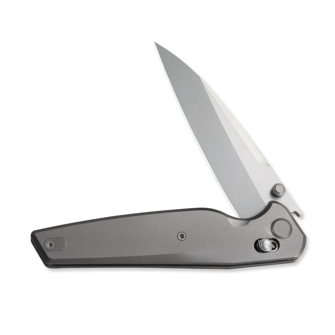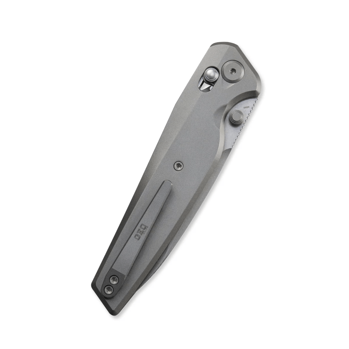 A markolat szürke Stonewash 6AL4V titánból készült, sima felülettel a biztos fogás és tartósság érdekében. A zsebklip titánból van, és a jobb oldali tip-up hordozásra van beállítva.