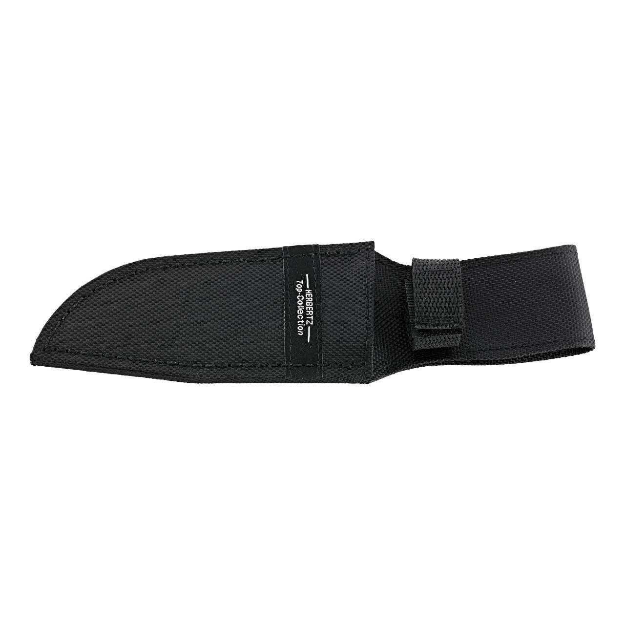 Taktikai kés, kés túlélési vagy szabadtéri tevékenységekhez Herbertz Top-Collection 527312 rozsdamentes acélból készült, szilárd, robusztus pengével, AISI 440, matt fekete felülettel. A fogantyútól egyoldalas fém fekete pajzs választja el, hogy megvédje a kezét. A fogantyú fekete-szürke Micarta anyagból készül, egy lyukkal a húrhoz és fém sarokkal. Nylon tokban van.