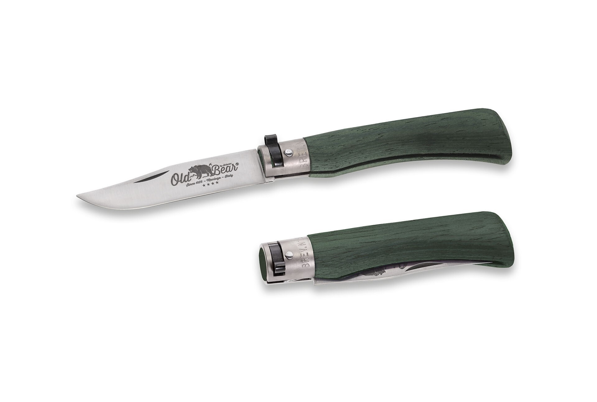 Az OLD BEAR logóval ellátott penge 420-as rozsdamentes acélból készült, manuálisan nyílik, egy bevágással a pengén. Nyitott helyzetben egy szabadalmaztatott forgózár tartja. A fogantyú lakkozott fából készült. A kés nincs felszerelve zsebcsipesszel.