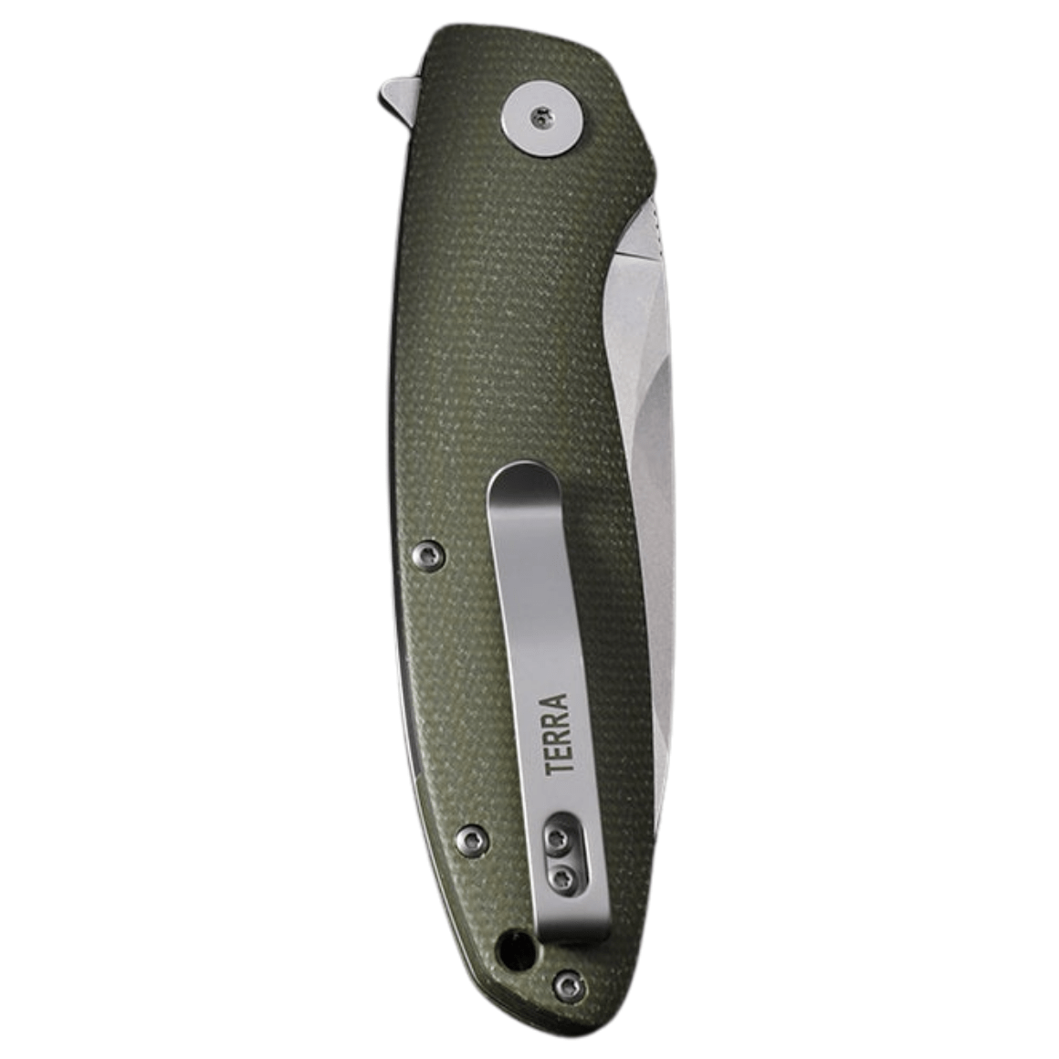 A markolat zöld Micarta anyagból készült. Ez egy kompozit anyag, amely lenvászonból és szintetikus gyantából áll, és kiváló fogást biztosít. A Micarta felszívja a kéz olajait, így egyfajta patinát képez. Ennek eredményeként minden kés idővel igazán egyedivé válik. Jobbkezes viseléshez deep carry rozsdamentes acél zsebklipsszel érkezik.