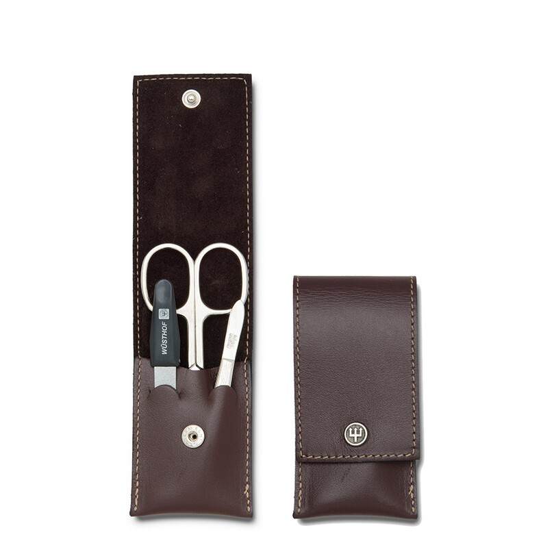 3 darabos manikűr szett kézzel készített barna bőr tokkal. A nikkelezett szerszámok szerkezetileg koordináltak, korrózióval védettek, nagyon tartósak és egyszerűen jól néznek ki. A készlet tartalmaz: köröm- és bőr ollót, reszelőt és csipeszt.