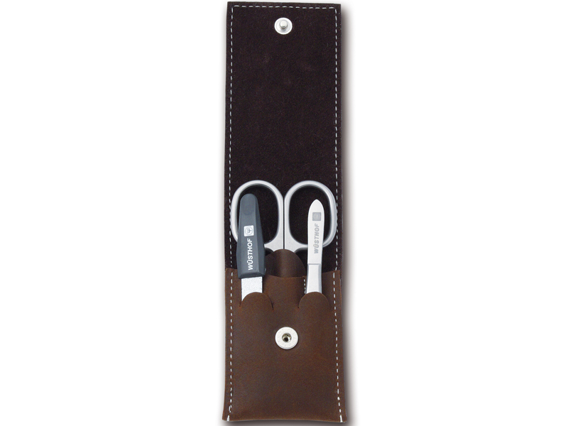 Háromrészes Wusthof manikűr , barna tokban, külső részén finom borjúbőrből és belül lágy bársonyos bársonyból.