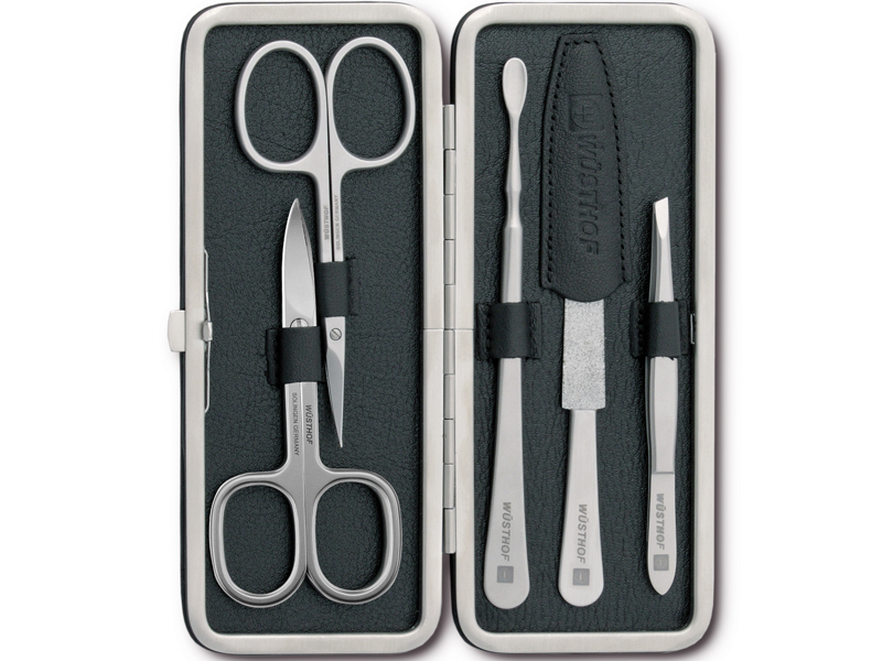 Öt darabos Wusthof manikűr fekete tokban, finom borjúbőrből és belül puha puha bársony velúrból. A tartalom rozsdamentes acél, szatén (matt) felülettel, sterilizált és korróziógátló.