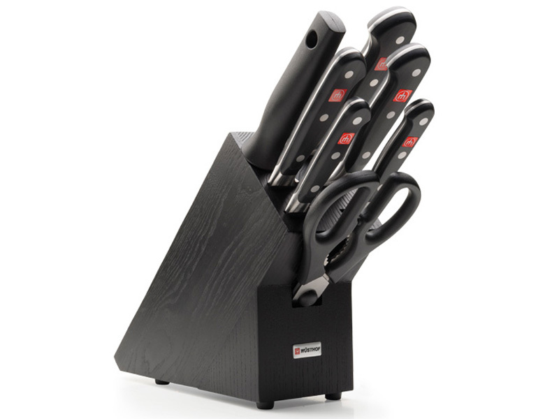 Korlátozott változat - A Wusthof Classic 7 db-os készlet 5 kést, konyhai ollót, acélt és egy sötét késblokkot tartalmaz.