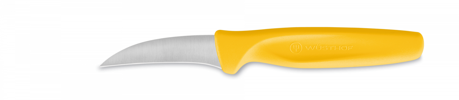 Wüsthof egy hámozó kés ívelt pengével, 6 cm hosszúságú, rozsdamentes acélból és műanyag sárga markolattal.. Ideális hámozással történő tisztításhoz, gyümölcs és zöldségfélék vágásához. Mosogatógépben mosható.