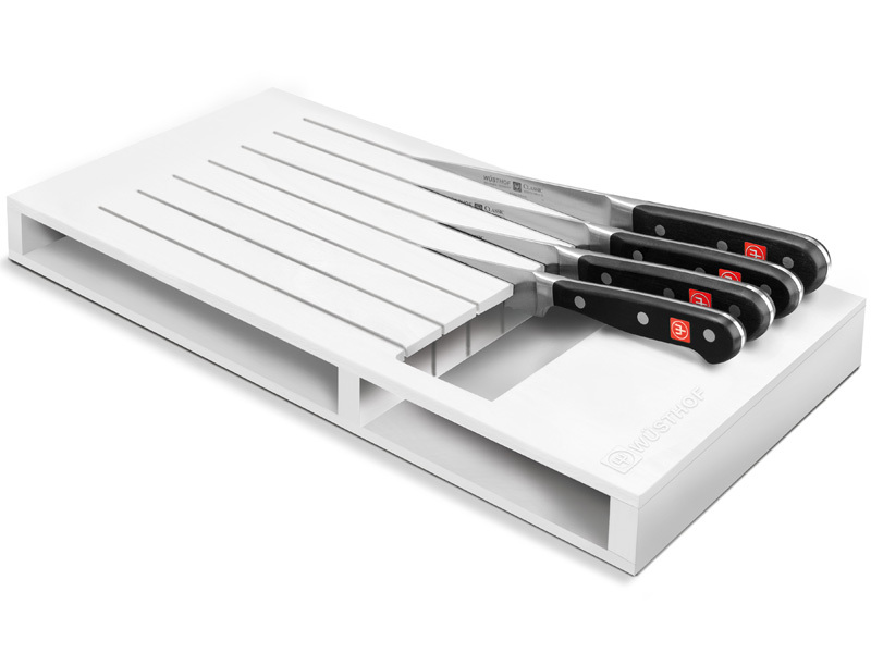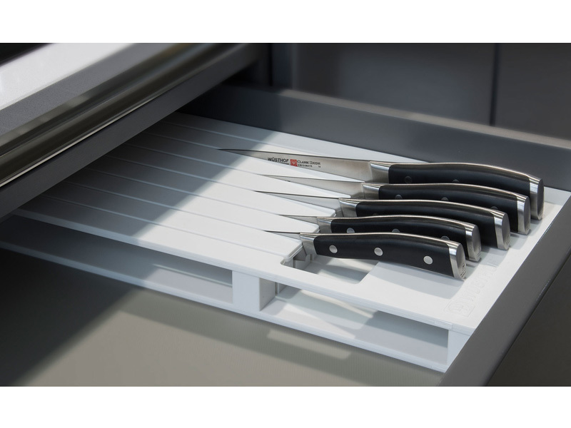 Elegáns és praktikus Wusthof szervező fehér műanyag fiókhoz, amelyet könnyű karbantartani. Minden szabványos fiókhoz és kihúzóhoz alkalmas. Az elülső részben található fogantyúk alatt található széles mélyedés megkönnyíti a kések eltávolítását, és védelmet nyújt az éles pengékkel szemben is. A hornyoknak köszönhetően a kések egyértelműen el vannak választva és mindig kéznél vannak. A kések tárolásának biztonságos és kényelmes módja.