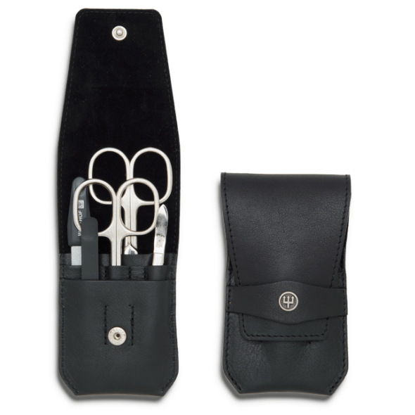 Minőségi manikűr fekete bőr tokban, a német Solingen Wüsthof gyártótól. Minden eszköz nikkelezett és korrózióálló, hosszú élettartamú. A készlet tartalmaz: köröm olló, bőr olló, körömreszelő, köröm- és bőrtisztító, csipesz.