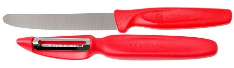 A praktikus Wusthof készlet kaparóból és egy piros színű univerzális késből áll.